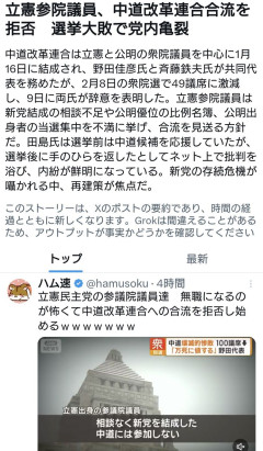 【悲報】立憲民主党の参議院議員、中道改革連合への合流を拒否