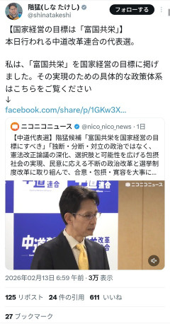 1:ブラッド君(茸) [ニダ]:2026/02/13(金) 14:49:50.81 ID:i61iyvII0 中道改革連合の新スローガン「富国共栄」wwwww 【国家経営の目標は「富国共栄」】本日行われる中道改革連合の代表選。私は、「富国共栄」を国家経営の目標に掲げました。その実現のための具体的な政策体系はこちらをご覧ください↓— 階猛(しな たけし) (@shinatakeshi) February 12, 2026 2:きいちょん(東京都) [IT]:2026/02/13(金) 14:51:34.22 ID:XMWzmHMe0 どうしてもあそこを栄えさせたいのか 3:スピーフィ(東京都) [CN]:2026/02/13(金) 14:51:38.61 ID:+iPo5sZ50 なんだ軍国主義ですか怖い怖いw…
