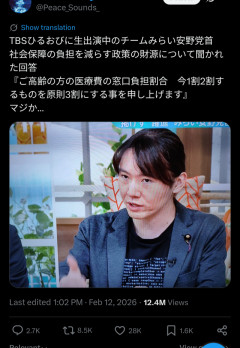 1: それでも動く名無し 2026/02/13(金) 12:21:33.97 ID:BxrS2K2S0 TBSひるおびに生出演中のチームみらい安野党首 社会保障の負担を減らす政策の財源について聞かれた回答 『ご高齢の方の医療費の窓口負担割合 今1割2割するものを原則3割にする事を申し上げます』 …