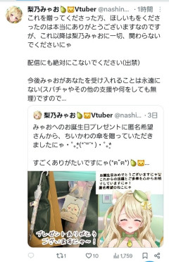 1: 2026/02/13(金) 15:22:46.789 これを贈ってくださった方、ほしいもをくださったのは本当にありがとうございますなのですが、これ以降は梨乃みゃおに一切、関わらないでくださいにゃ配信にも絶対にこないでください(出禁)今後みゃおがあなたを受け入れることは永遠にない(スパチャやその他の支援や何をしても無理)ですので… — 梨乃みゃお🍐🐱Vtuber (@nashinomyao) February 13, 2026 ※関連記事 【疑問】VtuberがアニメのOPを担当するとアニオタに嫌われまくる理由、マジで分からないwwwww…