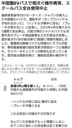 1: ジャン・ピエール・コッコ(東京都) [JP] 2026/02/13(金) 08:47:12.64 ID:AMcm+sgP0● BE:662593167-2BP(2000) sssp://img.5ch.net/ico/taxi.gif 引用元: ・ スポンサーリンク スポンサーリンク 27: ばら子ちゃん(茸) [RS] 2026/02/13(金) 08:59:26.34 ID:7BzdSk2E0 >>1 安モノは安いだけのことしか能がない そんなことも判らずに購入しているのかよww 60: ルミ姉(SB-Android) [PL] 2026/02/13(金) 09:18:28.35 ID:OcuCqTp30 >>1 安物買いの銭失い 82: KEIちゃん(埼玉県) [US] 2026/02/13(金) 09:32:02.89 ID:oMsAKfLj0 万博でも走った『EVバス』でトラブル相次ぐ > 「カーブでハンドルが切れなかったのには正直びっくりしました。 > あとは信号でモーターが停止したり、ブレーキの利きが悪かったりとか。 > (勝手に)ハンドルがいきなり回ることもありました」 >>1 はツイッターがソースだがテレビでもハンドルが勝手に回るって言ってる報道があったらしい 3: ティグ(庭) [ニダ] 2026/02/13(金) 08:48:58.17 ID:Vuc7h4cx0 国産を名乗るEVMJを許すな 4: なーのちゃん(神奈川県) [US] 2026/02/13(金) 08:49:14.77 ID:AVR/Ixt+0 保障などしない国のものなんかよく買えるなw 6: スカーラ(庭) [ニダ] 2026/02/13(金) 08:50:41.77 ID:HKDhyJif0 日本で騒がれて仕方無くリコールしたけど送られてきた対策部品の3割くらいが使い物にならない不良品だった例のバスか 7: レイミーととお太(埼玉県) [CN] 2026/02/13(金) 08:50:47.19 ID:5P1IKc6R0 変なもの買うからだよ 安物買いの銭失い 8: マカプゥ(茸) [ニダ] 2026/02/13(金) 08:51:17.99 ID:qo9Oox/V0 こんな危険物スクールバスに使うとか何考えてるの? 9: ぶんちゃん(庭) [US] 2026/02/13(金) 08:51:40.28 ID:SlGuVmJi0 ワイの生活範囲の京阪バスがいつやらかすかワクワクしている 10: キャティ(茸) [US] 2026/02/13(金) 08:51:50.68 ID:YNiE1JwJ0 これ日本製ですとかいいながらよくわからん中国のメーカーにつくらせてたんだろ? 17: ケロちゃん(ジパング) [US] 2026/02/13(金) 08:54:56.59 ID:H9i/ETOX0 >>10 日本製語るならせめて品質確認はしろよな…日本製のロゴ張り換えるだけの簡単な仕事で中抜しまくりやん 13: ドナルド・マクドナルド(やわらか銀行) [ニダ] 2026/02/13(金) 08:53:03.73 ID:xcOxkAjE0 日本に追いつき追い越した? 中国の技術は世界一?w 14: V V-PANDA(茸) [DK] 2026/02/13(金) 08:53:11.09 ID:2XZCcKj30 万博のやつもバスの墓場に停まったままらしいな 15: ドナルド・マクドナルド(やわらか銀行) [ニダ] 2026/02/13(金) 08:53:59.31 ID:xcOxkAjE0 公明党・記憶にございません 18: 元気マン(みかか) [ニダ] 2026/02/13(金) 08:55:27.53 ID:PshDUJ3o0 《トラブル続出》中国メーカーが製造したEVバス、関係者が明かす「日本でナンバーを取得した車両検査」のカラクリ 「実測で問題があっても書類上の計算で問題がなければクリア」との証言 19: おにぎり一家(茸) [GB] 2026/02/13(金) 08:55:55.34 ID:QsSD6NFW0 バスは、寿命クッソ長く使う物なのに。 その辺の乗用車より保たないのヤベェ 20: 暴君ベビネロ(ジパング) [US] 2026/02/13(金) 08:56:02.46 ID:AoOX8fw90 中国からのボタン1つで、乗員乗客全員サツせる バスに限った話じゃないけどな 22: ケロちゃん(ジパング) [US] 2026/02/13(金) 08:57:46.91 ID:H9i/ETOX0 >>20 ゆーはショック EVが空から落ちてくる ゆーはショック 中国人製のEVは指先一つでシャットダウンさー 25: ピーちゃん(東京都) [US] 2026/02/13(金) 08:59:08.47 ID:Ma7Pf5e80 バスではなく大型電動カートと正確に表現しなさい 26: さくらパンダ(やわらか銀行) [ニダ] 2026/02/13(金) 08:59:17.99 ID:jp0jVq0F0 国交省は何してるんだよ。 ちゃんと検査しろ 28: auシカ(ジパング) [EU] 2026/02/13(金) 08:59:40.00 ID:jb81VNzu0 ほらほらなんでも中華製にするから悪い 29: きこりん(東京都) [NO] 2026/02/13(金) 08:59:52.34 ID:u1nPnfFW0 中国メーカーのタブレットが高校で故障多発して問題になったのにまだ懲りないの? とにかく教育現場に危険な中華産排除を徹底しろ 31: らびたん(東京都) [US] 2026/02/13(金) 09:00:59.91 ID:uXFEH6tg0 テロじゃねえよ ただの不具合だ 中華製品てのは不良品リスクあるからこその値段なんだよ だから普通は不良品でもいい位の品物しか買わない それを役所は日本製品と同じ感覚で買う馬鹿で役立たずな頭してるからこうなる 38: エンゼル(ジパング) [IT] 2026/02/13(金) 09:03:58.97 ID:Qca32sE80 >>31 中国製のバスは自動運行狂ってるだけじゃなく 車体や窓枠の立て付けまでガタガタらしい 40: あまちゃん(茸) [US] 2026/02/13(金) 09:04:50.14 ID:HxmRw8Cm0 >>31 日本企業の場合は中国工場の不良品弾く為に検品に少なくない労力を割いてるんだよな あいつらサイレントチェンジ頻発してくるから検品サボったらリコールに直結するんだよ 44: ティグ(庭) [ニダ] 2026/02/13(金) 09:08:22.51 ID:Vuc7h4cx0 >>31 中華でもBYDは行政や企業と信頼を築いてシェアを伸ばしてるぞ 32: あまちゃん(茸) [US] 2026/02/13(金) 09:01:07.67 ID:HxmRw8Cm0 中国企業日本支社の中国製品がカタログスペック出せると思うなよ 35: ケロちゃん(ジパング) [US] 2026/02/13(金) 09:03:23.33 ID:H9i/ETOX0 とりあえずこの欠陥バス売った会社に損害賠償しろよ… 36: ハムリンズ(みかか) [FR] 2026/02/13(金) 09:03:31.71 ID:st8oPmhy0 車両は完全な中国製でも、こっちで乗降ボタンやら最後の架装すれば日本製