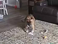 留守番中のワンコ。 リチウムイオン電池(?)を 内蔵している何かを 噛んでしまったようだ。 ペットカメラがその瞬間を捉えた……