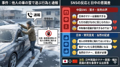 1: 名無し 2026/02/14(土) 11:15:32.48 ID:x7RkP9m2W 日本在住の中国人投稿者が、隣の駐車スペースにある車の雪で雪玉を作りボンネットに置いたところ、管理会社から「迷惑行為に関するお願い」という注意喚起の文書が全戸に配布される事態となりました。管理会社は、善意・悪意を問わず他人の車両に無断で触れる行為を禁止しており、損害賠償や警察出動の可能性についても言及しています。この件が中国のSNS「小紅書(RED)」に投稿されると、「日本社会は抑圧的だ」という批判から「他人の車を触られたくないのは当然だ」という賛同まで、4000件を超える多様なコメントが寄せられ反響を呼んでいます。 Record China ■要約 ・日本在住の中国人が他人の車の雪で遊び管理会社へ通報される ・管理会社は善意悪意を問わず他人の車両に触れる行為を禁止と注意 ・中国SNSでは日本の厳格なマナーに対し驚きや批判の声が噴出 ・一方で他人の所有物に対する配慮を当然とする賛同意見も多数 ・日中両国のマナー意識や権利意識の差を象徴する出来事として注目 【速報】 元TOKIOの国分太一さん、『緊急発表』キタァアアアアアーーーーー!! 中道改革連合「大敗を検証したけどよく分からなった」 【素人流出】 この陸上部女子大生、運動着のままハメ撮りされててエ※すぎる・・・…