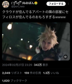 1: 2026/02/14(土) 11:07:34.25 もうこれ笑わせに来てるだろ… クラウドが住んでるアパートの隣の部屋にセフィロスが住んでるのおもろすぎるwwww pic.twitter.com/cwBgQOJkuL— (´༎ຶོv༎ຶོ`)ねおぽん🤮 (@pon_neo) February 27, 2024 ※関連記事 すまん。FF7何度やり直しても「セフィロスが何故狂ったのか」が分からんのだが…