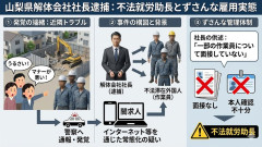 1: 名無し 2026/02/14(土) 19:25:44.31 ID:K9pL3m7X0 山梨県警は、就労資格のない中国人やタイ人を解体作業員として働かせたとして、中国籍の会社社長を不法就労助長容疑で逮捕しました。この不法就労は、作業員らが近隣住民とトラブルを起こし、通報を受けて駆けつけた警察官が確認したことで発覚しました。警察は不法滞在者の雇用が常態化していた可能性があるとみて、会社の実態を詳しく調べています。 読売新聞 ■要約 ・山梨県の解体会社社長が不法滞在の外国人を雇用し不法就労助長容疑で逮捕 ・作業員らが近隣住民とトラブルを起こしたことで不法滞在が発覚 ・インターネット等を通じた不法雇用の常態化が疑われている ・逮捕された社長は一部の作業員について面接していないなどと供述 【朗報】 日中緊張で中国スキー場に中国人客殺到、大混雑で「滑る気すら起きない」「マナー悪すぎる!」 【北京日報】中国SNSで「高市早苗」が大量トレンド入り 【画像】 最近のアラフィフ女子会、レベチwwwwwwwwwwwwwwwwww…
