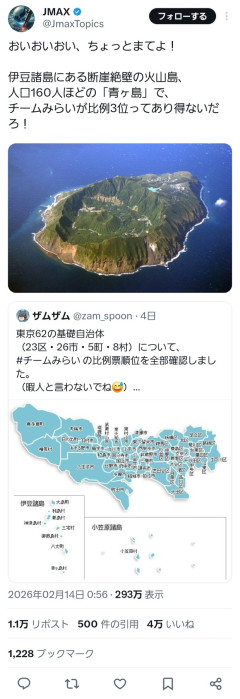 1:2026/02/14(土) 21:50:11.81 ID:WKjLlvbx0.netれいわの退潮は他人事か SNS「推し活」選挙と高市自民の行方おいおいおい、ちょっとまてよ!伊豆諸島にある断崖絶壁の火山島、人口160人ほどの「青ヶ島」で、チームみらいが比例3位ってあり得ないだろ! pic.twitter.com/bsZ0FcfPuQ— JMAX (@JmaxTopics) February 13, 2026転載元スレッド:…