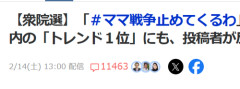 1: 2026/02/15(日) 04:12:21.70 【衆院選】「#ママ戦争止めてくるわ」SNSで広がった共感 国内の「トレンド1位」にも、投稿者が反響振り返る「ママ、戦争止めてくるわ」。自民党が圧勝した衆院選の終盤、2人の子どもを育てる清繭子さん=東京都=がX(旧ツイッター)に投稿したつぶやきが、大きな反響を呼んだ。ママの部分を「パパも」「独身男子も」「子どもいないけどおばちゃんも」と変え、ハッシュタグ(検索目印)を付けた投稿が相次ぎ、「#ママ戦争止めてくるわ」が一時、国内の「トレンド1位」になった。清さんは「一市民の私が子どもにかけた言葉を、みんなが希望のある言葉にしてくれた」と語る。 ※関連記事 【速報】『#ママ戦争止めてくるわ』Xでトレンド1位になる…