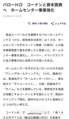 1 : 以下、?ちゃんねるからVIPがお送りします :2026/02/14(土) 20:36:39.952 ID:agDHJDdR0St.V.net バローHD コーナンと資本提携へ ホームセンター事業強化:地域ニュース : 読売新聞転載元スレッド:…