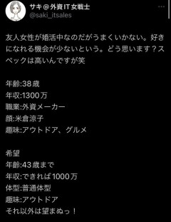引用元: それでも動く名無し 2026/02/07(土) 12:02:42.89 ID:OztYTc3j0 婚活コンサル「38の女は、男にとって無価値。年収1300万などなんの価値もない」 無事発狂した模様 2: それでも動く名無し 2026/02/07(土) 12:03:19.28 ID:6OTKWKPjr え?そんなに高いか? 3: それでも動く名無し 2026/02/07(土) 12:04:09.00 ID:+mRyoY5bH Xの婚活アカを真に受けるな…