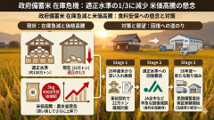 1: 名無し 2026/02/15(日) 11:18:42.15 ID:r6X9zPq2L 政府が保有する備蓄米の在庫量が、適正とされる100万トンを大きく下回り、32万トンまで減少する見通しとなっている。昨今の供給不安等に伴う放出が要因だが、備蓄の本来の目的である凶作時の対応能力に懸念が生じている。 農林水産省は2026年産米から買い入れを再開する方針だが、現在も米の販売価格が5キロ4000円台と高止まりしているため、市場からの買い戻しがさらなる物価上昇を招くリスクに苦慮している。食料安全保障の観点から計画的な備蓄回復を求める声がある一方、放出・買い入れのタイミング調整は極めて困難な局面を迎えている。 時事通信 ■要約 ・放出の影響で政府備蓄米の在庫が適正水準の3分の1にあたる32万トンまで減少 ・米価が5キロ4000円台の高値圏にあり買い戻しによるさらなる価格高騰を農水省が懸念 ・26年産米から例年の買い入れを再開し事前契約で21万トンを確保する計画 ・食料安全保障維持のためJA全中などは適正水準への早急な回復が必要と強調 ・流通の滞り解消を目指し26年度から民間業者への備蓄委託実証実験を開始予定 資本主義が良くて共産主義が悪いという謎の風潮 中国製の粗悪で低品質なロボットが年会参加中に痙攣してそのまま死去???? 水産庁、中国漁船の船長を釈放…
