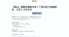 1 : (岡山)倉敷市連島中央1丁目付近で金銭授与 2月13日夕方 | NEWSjp岡山県警によると、13日午後5時45分ごろ、倉敷市連島中央1丁目付近の駐車場で男子中学生への金銭授与が発生しました。(実行者の特徴:女性、30〜35歳、長髪、赤色長袖、白色スカート) ■実行者の言動や状況 ・会話中の男子生徒らに声をかけ、金銭を渡した。 ・「お金に困るでしょ」 ・「これでお菓子でも買って食べて」全文はソースで…