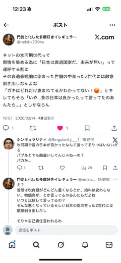 1: 2026/02/15(日) 12:29:18.08 ※関連記事 【悲報】氷河期おぢ「俺たちは時代の犠牲者」有識者「そんなことはないぞ」…