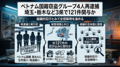 1: 名無し 2026/02/15(日) 13:05:42.18 ID:Qk8w9PzL2 埼玉県内の住宅で財布が盗まれるなどの被害が100件以上相次いで発生した事件で、ベトナム国籍の男女4人が栃木県内の住宅に侵入し現金を盗んだとして再逮捕された。 警察によると、4人は昨年11月に宇都宮市や壬生町の住宅へ侵入し、現金計7万5千円やネックレスなど50点以上を盗んだ疑いが持たれている。 このグループは11人のベトナム人で構成されており、昨年10月から11月にかけて埼玉県、栃木県、茨城県で発生した121件の忍び込み事件に関与しているとみて警察が詳しく調べている。 テレ玉(Yahoo!ニュース) ■要約 ・ベトナム国籍の男女4人が住宅侵入と窃盗の疑いで再逮捕 ・グループ全体で埼玉や栃木など3県で計121件の忍び込みに関与か ・宇都宮市などの住宅で現金やネックレス50点以上を盗んだ疑い ・別のメンバーは東松山市で現金13万円に加え果物類も窃取 ・警察は11人構成の窃盗グループによる組織的犯行とみて全容解明を進める 資本主義が良くて共産主義が悪いという謎の風潮 中国製の粗悪で低品質なロボットが年会参加中に痙攣してそのまま死去???? 水産庁、中国漁船の船長を釈放…