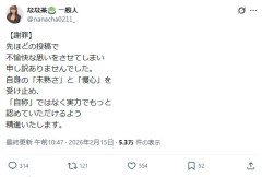 「一般人扱い」に怒りの女性ティックトッカーが謝罪「不愉快な…」アカウント名に「一般人」追加 ティックトッカー、YouTuber、グラビアアイドルのなな茶(29)が15日、自身のXを更新。「一般人」をめぐる投稿を削除した上で謝罪した。 な… (出典:日刊スポーツ) なな茶 なな茶(ななちゃ、2月11日 - )は、日本のグラビアアイドル、TikToker、YouTuber、起業家。芸能事務所はエイベックス・マネジメント、フィットを経て、現在は独立し個人事務所Clara Productionを設立。エージェント契約を複数社と結ぶ。静岡県浜松市出身。浜松市観光大使。血液型はAB型。本名:千葉… 34キロバイト (4,309 語) - 2026年2月12日 (木) 11:27 (出典 Pop'n'Roll(ポップンロール)) 誰がチンパンジーやねん… (出典 『一般人扱い』に怒りの女性ティックトッカーが謝罪 「インフルエンサーを蔑んで一般人って面白がる風潮 全く理解できない」発言で物議 [冬月記者★])1 冬月記者 ★ :2026/02/15(日) 14:04:06.12 ID:5z3MK7169 「一般人扱い」に怒りの女性ティックトッカーが謝罪「不愉快な…」 アカウント名に「一般人」追加 ティックトッカー、YouTuber、グラビアアイドルのなな茶(29)が15日、自身のXを更新。「一般人」をめぐる投稿を削除した上で謝罪した。 なな茶は11日にXで一般男性との結婚と第1子妊娠を公表。 「【ご報告】私事ですが、かねてよりお付き合いしていた一般男性と結婚いたしました。また、第一子を授かり安定期に入りましたことをご報告させていただきます」などと報告していた。 その投稿に対し、一般ユーザーから「おめでとうございます! あと、なな茶さんは一般人ではなかったんですね。それも驚きました!」との返信があった。 なな茶は「350万フォロワーいて 雑誌の表紙も何回もやったことあるのに 一般人扱いさせられてるのなに??」と怒りをあらわにした。 「14歳にアイドルデビューして、ドラマも複数出させていただいてるし今日で芸歴15年目なのですが」と主張。 「自分が知らない人やインフルエンサーを蔑んで一般人って面白がる風潮 全く理解できない」と投げかけた。 15日、「【謝罪】先ほどの投稿で 不愉快な思いをさせてしまい 申し訳ありませんでした。自身の『未熟さ』と『慢心』を受け止め、『自称』ではなく実力でもっと認めていただけるよう精進いたします」とポスト。当該ポストについて削除した。また、この日までにアカウント名は「なな茶 一般人」に変更されていた。 なな茶は浜松市出身で、浜松市観光大使。スリーサイズはB97-W59ーH96センチで、Jカップ。身長160センチ。Xのプロフィルには「tiktok380万人」とある。 関連スレッド 「一般人扱い?」人気TikTokerなな茶が怒り「自分が知らない人やインフルエンサーを蔑んで一般人って面白がる風潮理解できない」 [muffin★] (出典 『一般人扱い』に怒りの女性ティックトッカーが謝罪 「インフルエンサーを蔑んで一般人って面白がる風潮 全く理解できない」発言で物議 [冬月記者★])…