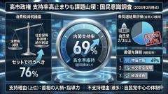 1: 名無し 2026/02/15(日) 20:45:22.18 ID:v8Xm9kR3z 日本経済新聞社とテレビ東京は13〜15日に世論調査を実施した。高市早苗内閣の支持率は69%で、1月の前回調査の67%からほぼ横ばいだった。「支持しない」は前回と同率の26%だった。 与野党で消費税減税を議論する「国民会議」のテーマに関して聞いた。「減税と社会保障の負担増や給付削減をセットで議論すべきだ」が76%で、「減税のみを議論すればよい」は17%となった。 衆院選で自民党が単独で3分の2の議席を得たことについては「もっと少なくても良かった」との回答が49%を占めた。「妥当な結果だった」が44%となった。 日本経済新聞 ■要約 ・高市内閣支持率は69パーセントと前回からほぼ横ばいの高水準を維持 ・消費税減税議論は社会保障の負担増や給付削減とセットで行うべきとの回答が76パーセント ・衆院選で自民党が3分の2の議席を獲得した結果に対し49パーセントが多すぎると評価 ・最優先課題は物価対策が49パーセントで最多となり外交安全保障や経済成長が続く ・支持理由は首相の人柄や指導力が上位となり不支持理由は自民党中心の体制が最多 資本主義が良くて共産主義が悪いという謎の風潮 中国製の粗悪で低品質なロボットが年会参加中に痙攣してそのまま死去???? 水産庁、中国漁船の船長を釈放…