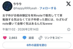 1: 2026/02/15(日) 20:16:07.965 女子枠が合格体験記を有料noteで販売してて草勉強する気はなくて女子枠使った割には、わざわざnote書いて金稼ぐ気はあるんだねwww— りりり (@happyRRRyeah) February 14, 2026 女子枠700円note、元々は学校の先生や駿台のチューターが厚意で教えてくれたテクニックを、あたかも自分のものかのように切り売りしてるの本当に面白い🤣これ売った金で買うキャラメルフラペチーノめちゃくちゃ美味いだろうな pic.twitter.com/rvFYSQWhCI— 卓越ろー (@kasazirokkata) February 14, 2026 ※関連記事 なぜ女子の難関大学進学率は低いのか?「差別では」との声もある女子枠設置で解決しないワケ…