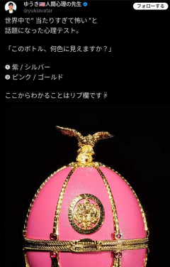 1: 2026/02/16(月) 06:45:33.97 世界中で“ 当たりすぎて怖い "と話題になった心理テスト。「このボトル、何色に見えますか?」❶ 紫 / シルバー❷ ピンク / ゴールドここからわかることはリプ欄です☟ pic.twitter.com/1cdlSKo3sc— ゆうき🇺🇸人間心理の先生 (@yukiavatar) February 14, 2026 ※関連記事 【画像】この漫画の「ダメ人間」と付き合っている彼女の話、少し怖くて草wwwww…
