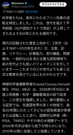 1: ななしさん@発達中 2026/02/15(日) 12:29:47.20 ● BE:237216734-2BP(3000)ID:xifZYNAg0 Scientists have identified a reversal of the long-standing Flynn effect—the roughly 200-year trend of rising average intelligence (measured via IQ and cognitive tests) across generations.For the first time in modern recorded history, Generation Z (born roughly 1997–2012) shows… pic.twitter.com/113X620gJ4— Massimo (@Rainmaker1973) February 13, 2026…