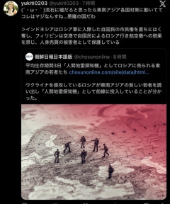 692 名前:名無しさん必死だな [sage] 投稿日:2026/02/14(土) 22:25:47.00 ID:F3JYEs9t0 平均生存期間3日「人間地雷探知機」としてロシアに売られる東南アジアの若者たち 朝鮮日報 ウクライナを侵攻しているロシアが東南アジアの貧しい若者を誘い出し「人間地雷探知機」として前線に投入していることが分かった。 ・・・(´・ω・`) 700 名前:名無しさん必死だな [sage] 投稿日:2026/02/14(土) 22:27:53.42 ID:0oneL65p0 >>692 ルンバでも走らせろよ(´・ω・`) 758 名前:名無しさん必死だな [sage] 投稿日:2026/02/14(土) 22:38:01.54 ID:UcB4rjWB0 >>692 ゴミを纏めて処分できるんだから一石二鳥 流石おそロシア!(´・ω・`) 738 名前:名無しさん必死だな [sage] 投稿日:2026/02/14(土) 22:34:03.69 ID:CjHSaNqI0 >>692 久々におそロシア あとこれそくたみ?(´・ω・`) 747 名前:名無しさん必死だな [sage] 投稿日:2026/02/14(土) 22:35:14.93 ID:0oneL65p0 >>738 この女の人、クソ懐かしいw(´・ω・`) 地雷グリコ 1 (ヤングアニマルコミックス)posted with AmaQuick at 2026.02.15暁月あきら(著), 青崎有吾(著)白泉社 (2025-02-28T00:00:00.000Z)Amazon.co.jpで詳細を見る 地雷なんですか?地原さん(8) (GANMA!)posted with AmaQuick at 2026.02.15りょん(著)GANMA! (2026-01-07T00:00:00.000Z)Amazon.co.jpで詳細を見る 裏バイト:逃亡禁止(17) (裏少年サンデーコミックス)posted with AmaQuick at 2026.02.15田口翔太郎(著)小学館 (2025-11-12T00:00:00.000Z)Amazon.co.jpで詳細を見る…