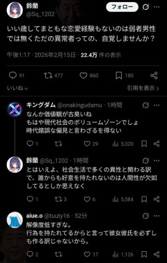 【画像】X「いい歳してまともな恋愛経験もないのは弱者男性ではなく異常者」