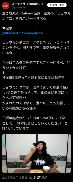 1: 2026/02/16(月) 17:08:41.35 ※関連記事 【動画】大食いYouTuberさん、何故か食べる位置が高すぎると話題に……一体何故?…
