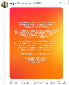 1: 匿名 2026/02/16(月) 20:34:08 人気ガールズバンド、ライブで痴漢被害「ステージを降りる=身体を触っていいではないからな?」 - 音楽 : 日刊スポーツガールズバンド「NEMOPHILA」のボーカリストmayuが15日、X(旧ツイッター)を更新。ライブ中に痴漢被害を受けたとして、怒りをあらわにした。同バンドは… - 日刊スポーツ新聞社のニュースサイト、ニッカンスポーツ・コム(nikkansports.com)nikkansports.com mayuはライブ後、「今日の甲府ライブありがとうございました!」とメッセージを掲載。感謝を述べつつ、「ステージを降りる=身体を触っていいではないからな?」と観客に忠告した。フロアに降りた際に痴漢被害を受けたそうで、「肩とか背中とか手とか、常識の範囲でいい所もあるが今日はガッツリ右乳触った奴いたからな? それはチカンです。犯罪です」と怒りを示した。…