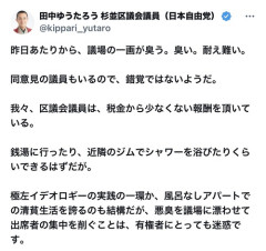 1: 2026/02/17(火) 21:15:24.98 昨日あたりから、議場の一画が臭う。臭い。耐え難い。同意見の議員もいるので、錯覚ではないようだ。我々、区議会議員は、税金から少なくない報酬を頂いている。銭湯に行ったり、近隣のジムでシャワーを浴びたりくらいできるはずだが。… pic.twitter.com/wSOq9JK6nR— 田中ゆうたろう 杉並区議会議員(日本自由党) (@kippari_yutaro) February 17, 2026 ※関連記事 【画像】この漫画の「ダメ人間」と付き合っている彼女の話、少し怖くて草wwwww…
