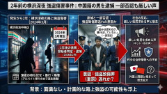 1: 名無し 2026/02/18(水) 11:20:45.12 ID:kAnA9AwA0 2024年3月、横浜市中区で帰宅途中の女子高校生(当時)を殴打し財布を奪ったとして、神奈川県警は中国籍の27歳の男を強盗傷害の疑いで逮捕した。被害者の女性は顔などを複数回殴られ、全治2週間の怪我を負った。 調べに対し、男は「バッグを引っ張って財布は盗んだが、殴ってはいない」と容疑を一部否認している。事件から約2年、執念の捜査が実を結んだ形だが、外国人犯罪への懸念がネット上で再燃している。 Yahoo!ニュース(日本テレビ系) ■要約 ・2年前(2024年3月)に発生した女子高生への強盗傷害事件で中国籍の男を逮捕 ・深夜の横浜市中区で、アルバイト帰りの女性を待ち伏せし暴行・略奪した疑い ・容疑者は「盗みは認めるが、暴行はしていない」と一部否認(強盗致傷罪逃れの意図か) ・犯行時、容疑者と被害者に面識はなく、計画的な路上強盗の可能性も ・昨今の治安情勢や外国人問題と相まって、厳しい処罰を求める声が上がっている 【朗報】しばき隊、暴行容疑での起訴確定で活動資金もろとも完全沈没。総取締の激昂で「日当カット」の... 【今日の人気News】 中道小川新代表、泉健太に実質戦力外通告wwwww 【謎】 アメリカ人が衝撃を受けた日本の「価格差」。母国では3倍する“ある食べ物”とは・・・…
