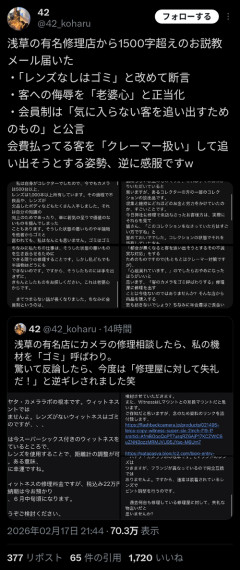 1: 2026/02/18(水) 09:16:14.26 浅草の有名店にカメラの修理相談したら、私の機材を「ゴミ」呼ばわり。驚いて反論したら、今度は「修理屋に対して失礼だ!」と逆ギレされました笑 pic.twitter.com/CcXMK7UIrJ— 42 (@42_koharu) February 17, 2026 浅草の有名修理店から1500字超えのお説教メール届いた・「レンズなしはゴミ」と改めて断言・客への侮辱を「老婆心」と正当化・会員制は「気に入らない客を追い出すためのもの」と公言会費払ってる客を「クレーマー扱い」して追い出そうとする姿勢、逆に感服ですw pic.twitter.com/B6zCa3lrPf— 42 (@42_koharu) February 17, 2026 ※関連記事 【動画】中国人コスプレイヤーさん、カメラマンに囲まれながらとんでもない事をしてしまうwww…