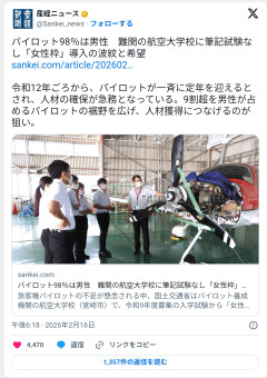 1: ななしさん@発達中 2026/02/18(水) 11:24:26.49 ID:XFD6SQyk0 パイロット98%は男性 難関の航空大学校に筆記試験なし「女性枠」導入の波紋と希望旅客機パイロットの不足が懸念される中、国土交通省はパイロット養成機関の航空大学校(宮崎市)で、令和9年度募集の入学試験から「女性枠」の導入を検討している。日本では12年ごろから、パイロットが一斉に定年を迎えるとされ、人材の確保が急務となっている。9割超を男性が占めるパイロットの裾野を広げ、人材獲得につなげるのが狙い。国土交通省によると、主要航空会社に勤務するパイロットは6年1月時点で40代以上が約7割を占め、最も多いのは50代。航空需要が高まる中、今後大量退職の時期を迎えると必要なパイロットの人数が確保できない恐れがある。男女格差の是正も課題だ。現役女性パイロットの割合は約1・9%、航空大学校の在学生も約400人のうち、女性は約4%にとどまる。このため国交省は航空大学校の入学要件だった身長制限(158センチ以上)を8年度の募集から撤廃。9年度の入学試験からは筆記試験を課さず、志望理由書など「人物中心の評価」で判断する新たな試験区分の導入を検討している。募集定員108人のうち、新区分の定員を30人とし、うち20人を女性枠とする見通しだという。(全文・続きはソースにて)…