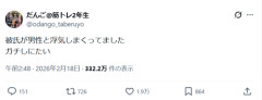 1: 2026/02/18(水) 14:46:59.247 彼氏が男性と浮気しまくってましたガチしにたい— だんご@筋トレ2年生 (@odango_taberuyo) February 17, 2026 ※関連記事 【画像】この漫画の「ダメ人間」と付き合っている彼女の話、少し怖くて草wwwww…