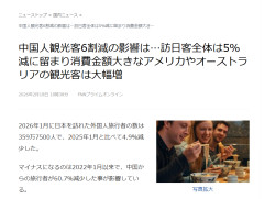 1: 名無し 2026/02/19(木) 11:53:08.75 ID:fEoIwObt0 日本政府観光局(JNTO)が発表した2026年1月の訪日外国人客数は359万7500人で、前年同月比4.9%減となった。 マイナス成長は2022年1月以来4年ぶりで、中国からの旅行者が約6割減少したことが大きく影響している。 一方で韓国が単月として初の110万人を突破したほか、台湾や欧米豪からの客数は大幅に増加しており、1人あたりの消費額が高い国々が全体の減少幅を抑制する形となった。 ライブドアニュース ■要約 ・1月の訪日客数は359万7500人で前年比4.9パーセント減少 ・中国政府の渡航自粛呼びかけや便数減少により中国客が60.7パーセント激減 ・韓国は117万6000人で過去最高を記録し台湾や欧米諸国も軒並み二桁増 ・欧米勢は1人あたり消費額が30万円を超え中国の24万円を大きく上回る ・インバウンド市場は特定国依存から脱却し多様化と高単価化が進行 参議院の首相指名 立憲民主党の一部議員が中道の小川淳也に投票せず 米原の死体遺棄 シリア国籍(無職)を逮捕 被害者の首に絞められた痕跡 【動画】今日本人が台湾に行くと大変なことになる模様・・・…