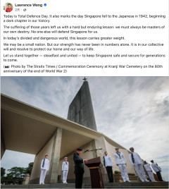 1: 名無し 2026/02/19(木) 12:15:22.48 ID:w8X9kM2R0 シンガポールのウォン首相は、1942年に日本軍による占領が始まった2月15日の「国防の日」に際し、SNSでメッセージを公開した。 ウォン氏は「私たちの歴史に暗い1章が始まった日」と振り返り、他国に頼らず自らの手で国を守ることの重要性を強調。 分断が進む現代の世界情勢において、国民が団結して未来の世代のために安全な国を築くよう呼び掛けた。 Record China ■要約 ・シンガポールが日本軍による占領開始日の2月15日に「国防の日」の行事を実施 ・ウォン首相がSNSで占領期を「歴史の暗い1章」と表現 ・自らの運命を他国に委ねず自力で守るべきだとする教訓を強調 ・分断され危険な現在の世界情勢において国民の団結を呼び掛け 参議院の首相指名 立憲民主党の一部議員が中道の小川淳也に投票せず 米原の死体遺棄 シリア国籍(無職)を逮捕 被害者の首に絞められた痕跡 【動画】今日本人が台湾に行くと大変なことになる模様・・・…