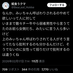 1: 2026/02/19(木) 14:21:04.39 なんか、みぃちゃん呼ばわりされるのやめて欲しいって人に対していままで散々チー牛やら弱者男性やら言うてたのお前ら女側だろ、みたいに言う人ら多いけど上のみぃちゃん呼ばわりされてる人がそう言ってたなら批判するのも分かるんだけど、そうでないのに女性って括りだけで批判するのは違うくね— 𩸽食うクマ (@Bear_eat_Hokke) February 16, 2026 チー牛、最初はチーズ牛丼頼みそうな顔としてルッキズム半分同族の自虐半分程度のものでしかなったんだよミームとして定着すると後から女がブサイクだから低年収、ブサイクだから発達障害、ブサイクだから性犯罪者と差別的な意味を追加し続けて今に至るのだが? — みいちゃん (@kansei_ga_sugoi) February 18, 2026 ※関連記事 【画像】この漫画の「ダメ人間」と付き合っている彼女の話、少し怖くて草wwwww…