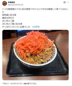 1. 匿名@ガールズちゃんねる 【画像】レスラーが紅生姜特盛で謝罪も「やっぱりこのくらい必要」新たに公開した衝撃画像 吉野家の紅生姜トッピングにおいて、いわゆる“適量”の指針を示していると思われるのが、同社の公式Xによる2022年5月17日の投稿だ。 いったい紅生姜はどれほど入れていいものなのか――? 吉野家広報担当者を直撃した。すると、以下のような回答が返ってきた。 《もともと吉野家の紅生姜は、1899年(明治32年)創業時に牛丼に添えて出したのが始まりです。当時、魚河岸で働く江戸っ子に粋な計らいが受け入れられ、以来長くご好評をいただいております。お客様それぞれのお好みの量をお取りください》(広報担当者) なお、本間の紅生姜愛については《ご満足いただけているなら何より》とのことだった。 《お客様それぞれのお好みの量をお取りください》――これが最終結論ということだろう。いかにも吉野家らしい粋なサービスである。 関連トピ 2026/02/19(木) 12:41:37…