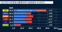 1: それでも動く名無し 2026/02/20(金) 05:02:50.17 ID:ApFW/3Rb0 去年のwarから今季退団した選手を除くとこうなる模様 やっぱ阪神圧倒的やな…