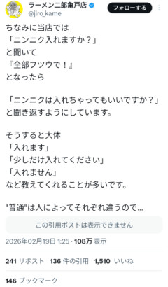 1: 2026/02/19(木) 15:04:04.81 ID:k+AAdQ9302: 2026/02/19(木) 15:06:20.54 ID:lPDT7iZOdはぇ^~3: 2026/02/19(木) 15:06:23.56 ID:A1t4vS9b0お前の店はスタンダードが無いのかよ4: 2026/02/19(木) 15:06:59.09 ID:Y2DSyCSs0店の推奨してる味を頼んでるんだろw5: 2026/02/19(木) 15:07:03.45 ID:nqRuuvoH0これならテーブルにニンニクの瓶置いとけばよくね6: 2026/02/19(木) 15:07:41.75 ID:nqRuuvoH0コショウかけますかみたいなことだろ7: 2026/02/19(木) 15:08:22.72 ID:i9ZF+/ez0全部普通って言う客はその店のスタンダードど真ん中をひとまず食ってみたいんだよ 察しろよ8: 2026/02/19(木) 15:08:49.12 ID:dRHkX80G0食券で全部済ませろよもう9: 2026/02/19(木) 15:09:10.65 ID:2va6BEPd0ただしイカツいあんちゃんには言えない10: 2026/02/19(木) 15:09:13.06 ID:QHdJ2Gsn0味に自信ないだけじゃん ニンニク入れて誤魔化してるだけ -->…