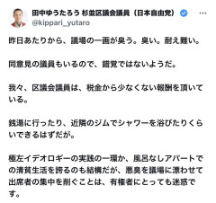 1 : 田中ゆうたろう 杉並区議会議員(日本自由党) @kippari_yutaro 昨日あたりから、議場の一画が臭う。臭い。耐え難い。 同意見の議員もいるので、錯覚ではないようだ。 我々、区議会議員は、税金から少なくない報酬を頂いている。 銭湯に行ったり、近隣のジムでシャワーを浴びたりくらいできるはずだが。 極左イデオロギーの実践の一環か、風呂なしアパートでの清貧生活を誇るのも結構だが、悪臭を議場に漂わせて出席者の集中を削ぐことは、有権者にとっても迷惑です。 2 : 3 : カードゲーマーでも住み着いてんのか…