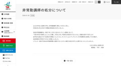 1 : 非常勤講師の処分について 2026.01.28 公立大学法人長野大学は、非常勤講師(男性、40代)に対し、令和8年1月16日付で停職の懲戒処分を行いました。 当該非常勤講師は、令和7年11月25日のオンライン授業において、一部の学生が遅刻したことに立腹し、学生に対し不適切な発言をするとともに、授業を途中で切り上げ、全学生を退出させて全員を欠席扱いとしたうえ、オンライン上にアップしていた学習教材も削除して引き揚げ、当該授業の学習ができない状態にしました。 こうした一連の行為は本学諸規程に違反することから、厳正な処分を行い公表することといたしました。 公立大学法人長野大学 理事長 平井 利博…