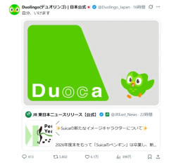 1: 名無しの旅人 2026/02/21(土) 13:59:06.66 ID:tkKZcdz/9 「自分、いけます」――2026年度末に引退予定の「Suicaのペンギン」の後継キャラに、語学アプリ「Duolingo」のフクロウやPostPetの「モモ」など、他社のキャラクターが続々と立候補し、カオス状態になっている。 【画像】 きっかけは、JR東日本が2月19日、新キャラの選考プロセスをXなどで発表したこと。長く愛されたペンギンの交代に強い反対が残る中、選考プロセスが発表されたことで、他社キャラ“乱入”の隙を与えた格好だ。 語学アプリ「Duolingo」のX公式アカウントは、JR東の新キャラ選考プロセスの投稿を引用する形で、「自分、いけます」と立候補。「Duoca」というSuica風のカードにフクロウをデザインした画像を投稿した。フクロウの緑とSuicaの色はイメージ近く、違和感がない。 このポストには「JR東日本アプリ」から「かわいい」と返信があり、デュオリンゴが「DM待ってるね!!」とマジレスしている他、フォロワーから「タッチした時に英語の問題出してきそう」「連続記録切れたら改札通れなくなりそう」といった感想が出ている。 「So-net」の公式キャラとして活躍する、PostPet(ポスペ)のピンクのクマ「モモ」も「ハーイ!」と立候補。共通ポイント「Ponta」のたぬきのキャラクター「パパポンタ」「せんせい」も「希望職種:新キャラクター」というカードを持って「自分 いつでもいけまっす!」と情熱を燃やしている。 国指定重要無形民俗文化財「相馬野馬追」の公式Xは、アイコンの馬のイラスト画像をあしらったSuica風カード「Nomaca」の画像を添えて「自分、やれます」と意気込みを見せた。 この他にも、写真アプリSNOWの「青春ねずみ」などさまざまなキャラクターがムーブメントに乗って立候補しており、各社のキャラのPR合戦の様相を呈している。 JR東が発表した新キャラ選考スケジュールでは、放送作家で脚本家の小山薫堂さんを座長とする選考委員会を2月に立ち上げ、委員会が若手クリエイターに原案イラストの制作を委託。そのうち3つの候補を夏に公表し、一般投票を行う。選考結果を11月18日に発表し、冬に愛称を公募。27年4月にデビューするという手順になっている。 [ITmedia NEWS] 引用元:…