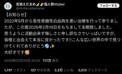 1: 2026/02/21(土) 18:37:54.88 【お知らせ】2022年9月から急性骨髄性白血病を患い治療を行って参りましたが、この度2026年2月19日をもちまして永眠致しました。思うように活動出来ず悔しさと申し訳なさでいっぱいですが、皆様と出会えて本当に良かったです!!こんな広い世界の中で見つけてくれてありがとう🌏✨大好きです🥰— 宮城えだまめ🫛🍠個人勢Vtuber (@vtuber_edamame) February 20, 2026 ※関連記事 【朗報】美少女Vtuber「彼氏いるよ」という切り抜きが拡散→運営「消せ消せ消せ」Vtuber「ネタでした」…