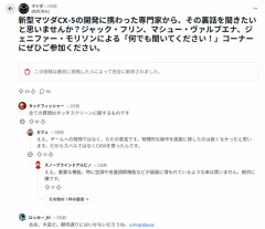 2 グロリア(やわらか銀行) [US] 2026/02/20(金) 18:16:24.92 ID:zQmA/Xom0 米掲示板Redditのマツダサブレディット(コミュニティ)に、マツダの新型CX-5開発関係者に質問しませんか?という投稿がされるも、物理ボタン廃止へのバッシングが殺到し、投稿者がアカウントごと削除。北米マツダ公式がプロフィール内で再度投稿しなおす。 しかし表示されてる質問数に疑念がわく。※現在質問は表示されるようになった模様。 引用元…