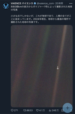 1: 2024/01/18(木) 18:48:42.26 ID:Zlj/6jTA0 約60億kmの彼方からボイジャー1号によって撮影された地球の写真小さな点でしかないが、これが地球であり、人類の全てがここに詰まっています。2024年現在、地球から最遠の場所で撮影された地球の写真です。 pic.twitter.com/4DysB3l5Tg— VAIENCE バイエンス (@vaience_com) January 17, 2024 2: 2024/01/18(木) 18:49:51.06 ID:ybH1TVpr0 そら60億キロ離れたら太陽でも小さいだろ 8: 2024/01/18(木) 18:55:19.46 ID:UT7CK8qY0 ボインジャー2号はどこおるん?…