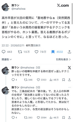 【悲報】高市早苗、水商売のテクニックを使っていた