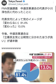 中革連の代表が小川淳也氏に代わり党のイメージが「変わった」13.0%「変わらない」81.4%