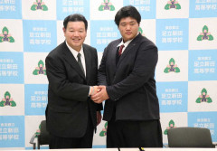 1: 匿名 2026/02/16(月) 22:49:12 ID:f7QEBNVd9 大相撲の春日野部屋に入門する東京・足立新田高3年の甲斐田龍馬(18)が16日、東京都足立区の同高で会見した。 入門のきっかけは春日野部屋付きの清見潟親方(元関脇・栃煌山)の存在だった。 「高校に入ってから清見潟親方に、ずっと声をかけてもらって、段々会っていくうちに、この人がいいなと思って、入門を決めた」。 人間性にも引かれ、「腰が低いしゃべり方なので凄いなと。 “君だったら、大相撲で上を目指せるよ”と言われた」と話した。 父は春日野部屋の元力士で、師匠の春日野親方(元関脇・栃乃和歌)の現役時代に付け人を務めた縁もある。 「3年くらいで関取になりたい。 師匠みたいな相撲を取れたらいいなと思っている」と力を込めた。 春日野親方も「素直さもある。 長所を伸ばしてスケールの大きい相撲を取らせたいと思う」と期待した。 1メートル91、155キロの高校生離れした体格を生かした圧力や突っ張り、力強い四つ相撲などが持ち味。 「両親のご飯が、おいしかったりして、この体格を手に入れた」と好きな餃子を一日60個食べることもあるという。 昨年の全国高校総体3位、全国高校選抜十和田大会準優勝、国民スポーツ大会少年の部準優勝などの実績を持ち、 春場所(3月8日初日、エディオンアリーナ大阪)で、三段目最下位格付け出しで初土俵を踏む。 目標も大きく「横綱になりたい」と意気込んだ。 東京・足立新田高で会見する甲斐田(右)と春日野親方(撮影・中村 和也) スポニチアネックス 春日野部屋入門の1メートル91、155キロ“規格外”高校生が会見 好きな餃子を一日60個食べることも(スポニチアネックス) - Yahoo!ニュース 大相撲の春日野部屋に入門する東京・足立新田高3年の甲斐田龍馬(18)が16日、東京都足立区の同高で会見した。 入門のきっかけは春日野部屋付きの清見潟親方(元関脇・栃煌山)の存在だった。「高校にYahoo!ニュース…