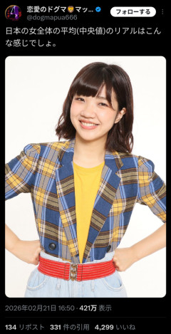 1: 2026/02/23(月) 01:09:54.31 日本の女全体の平均(中央値)のリアルはこんな感じでしょ。 pic.twitter.com/dAXG0dCsXE— 恋愛のドグマ🦁マッチングアプリ恋活婚活で幸福を掴ませる (@dogmapua666) February 21, 2026 ※関連記事 【画像】整形女さん達、自分の顔面偏差値を70だと思い込んでいたwww…