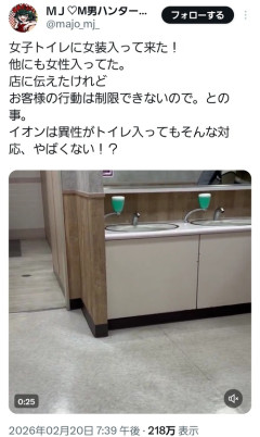 1: 2026/02/23(月) 06:19:34.48 女子トイレに女装入って来た!他にも女性入ってた。店に伝えたけれどお客様の行動は制限できないので。との事。イオンは異性がトイレ入ってもそんな対応、やばくない!? pic.twitter.com/bgM7bdhBki— MJ♡M男ハンター肉食系 (@majo_mj_) February 20, 2026 ※関連記事 【動画】女装に目覚めた男子高校生、覚醒するwwwwwwwwwww…
