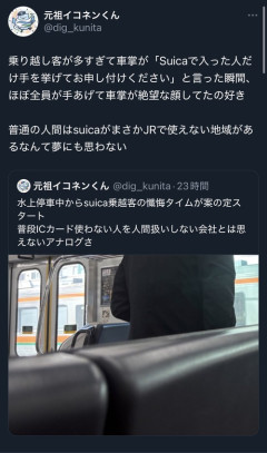 【悲報】車掌「えーこのエリアはSuica使えません。Suicaで入った人だけ手を挙げてください」→ほぼ全員挙手→車掌「えええ(絶望」