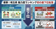1: 名無し 2026/02/23(月) 13:10:42.55 ID:SaI7ama0X 埼玉県が「都道府県魅力度ランキング」で初めて最下位となりました ブランド総合研究所の2025年調査によれば、埼玉県は前回の46位からさらに順位を下げ、47位を記録しています 項目別では「教育・子育てのイメージ」が全国2位、「居住意欲度」が16位と住みやすさでは良好な評価を得ている一方、「観光意欲度」は最下位でした また、「食事がおいしい」というイメージは6年連続でワーストを更新しており、名物グルメの魅力発信が課題とされています ネット上では治安に関する懸念が多く寄せられており、特にクルド人ら外国人による犯罪や迷惑行為の増加が魅力度に影響を与えているとの指摘も目立ちます Rapt理論+α ■要約 ・魅力度ランキングで埼玉県が調査開始以来初の最下位を記録 ・教育や子育て環境は全国2位と高評価も観光やグルメのイメージが壊滅的 ・食事がおいしい項目では改善が見られず6年連続で全国ワースト ・ネット上では外国人による犯罪や不祥事に伴う治安悪化を不安視する声が噴出 ・県民のアイデンティティ欠如や魅力発信力の弱さが低評価の要因と分析 「ママは何を止めにいったの?」のド直球なツッコミに反戦団体が沈黙。「そもそも日本は戦争を仕掛けてないだろ」と矛盾を突かれ、お花畑のプロパガンダが... 識者「日本レアアース、含有率1/100、精製特許無し、コスト10倍、産業化まで20年。結論ゴミ」 【無修】 人気美女アイドルのセ○動画が流出!!これは□□すぎるだろ・・・…
